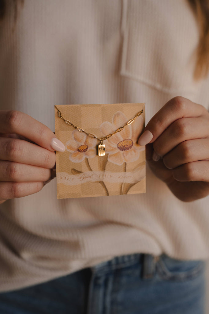 Displayed on a textured card featuring beautiful artwork by Lauren Ferguson of The Golden Designs. Full verse reference included on the back of the card.