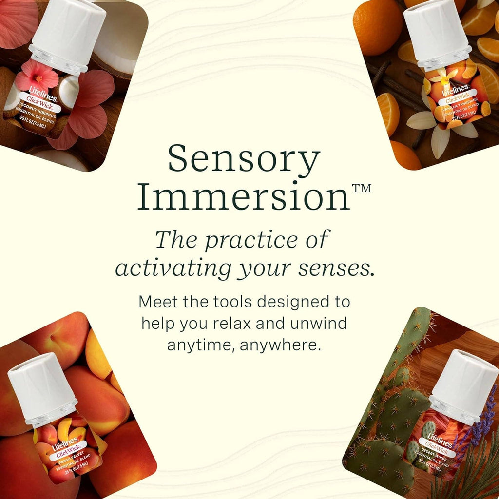 Designed exclusively for Lifelines ClickWick™ Diffusers ****(Candle, Plant, and Shower Diffusers ONLY USE CLICKWICK OILS***********), Lifelines ClickWick™ Refills feature our patent pending diffusion cap and specially formulated Essential Oil Blends. Pair them with any Lifelines ClickWick™ product to transform your space into a unique sensory experience. Pack contains four fresh blends - Vanilla/Tangerine, Coconut Hibiscus, Peach Velvet, Desert Canyon Air