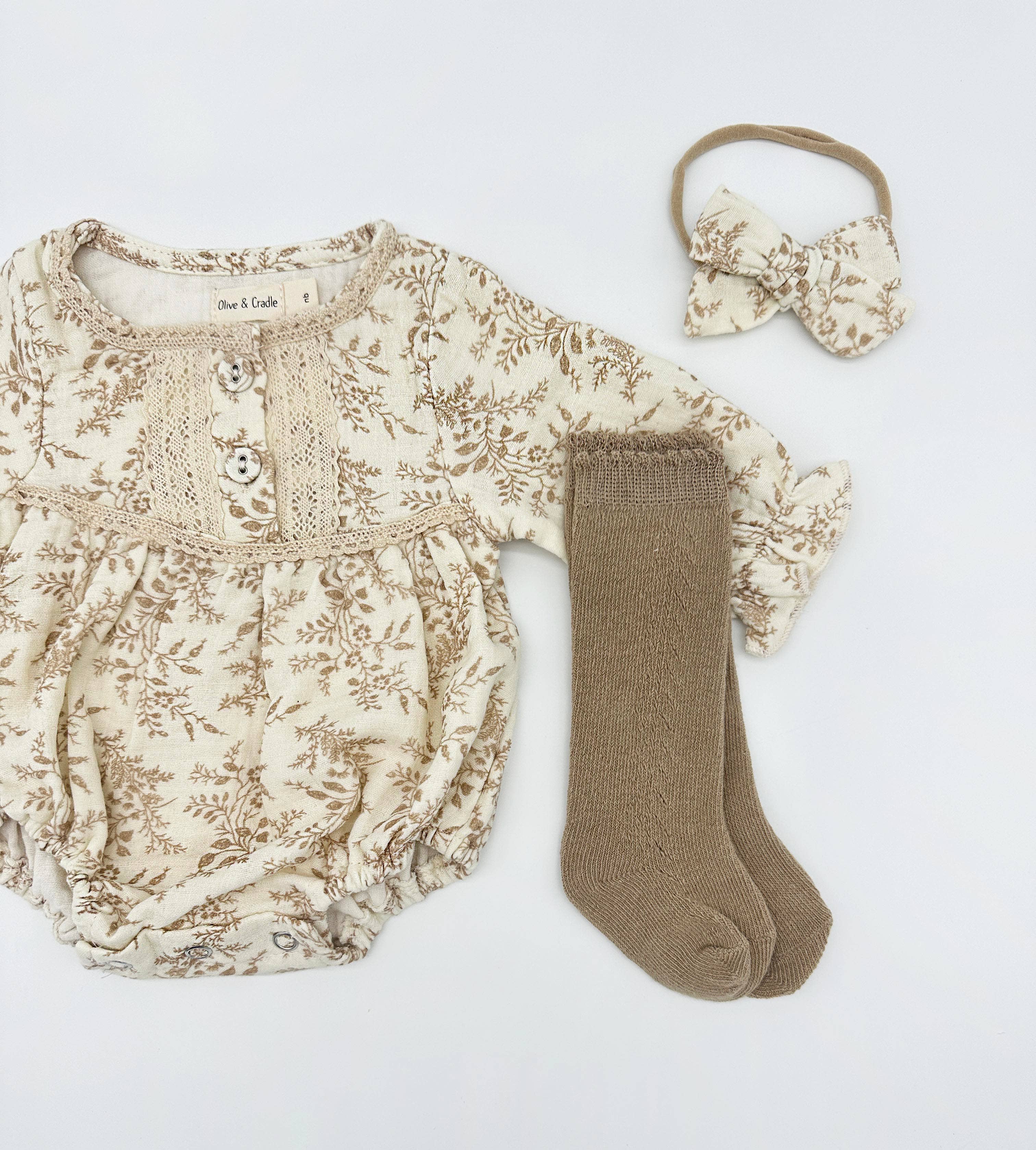 Ideal for spring, summer, or fall, the romper includes a matching bow and pairs effortlessly with optional knee-high socks and a cozy cardigan for a complete look. Available in both short-sleeve and long-sleeve options.